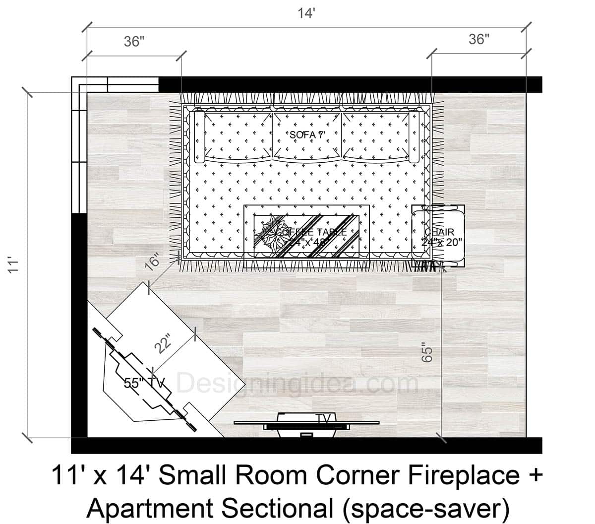 11×14 Small Room Floor Plan with Corner Fireplace & Sofa