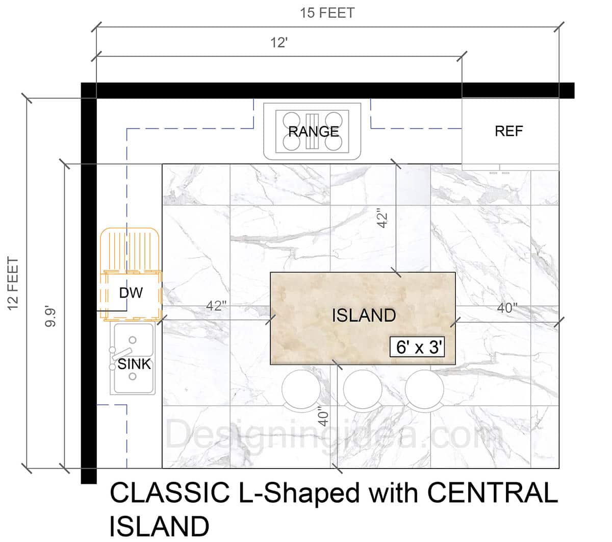 Classic L-Shaped With Island | 15′ × 12′ | 6′ × 3′ island, 3 stools, prep and serving space | Balanced family that wants seating and efficiency |