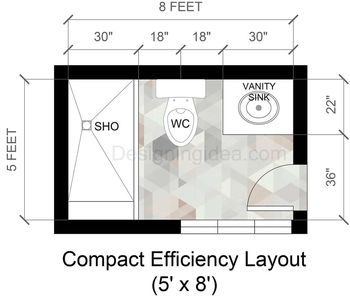 Layout Details: This small 5×8 bathroom is a 3/4 layout with a sink, toilet, and shower. The layout is efficient, and everything’s got its job to do, with no wasted space. You’ve got three distinct zones, including a 60″ x 30″ shower, a toilet with adequate code clearances, and a 22″ x 30″ single sink vanity. The shower sits on the left side in the corner and is the furthest from the doorway, so it doesn’t interfere and helps better utilize the far wall. The toilet sits in the middle, so it’s not the first thing you see when you open the door. The small vanity is positioned in the upper right corner, providing essential storage and counter space. The layout respects modern walkway and toilet clearances without feeling cramped, and you can actually stand at the sink with 36″ of clearance behind you.