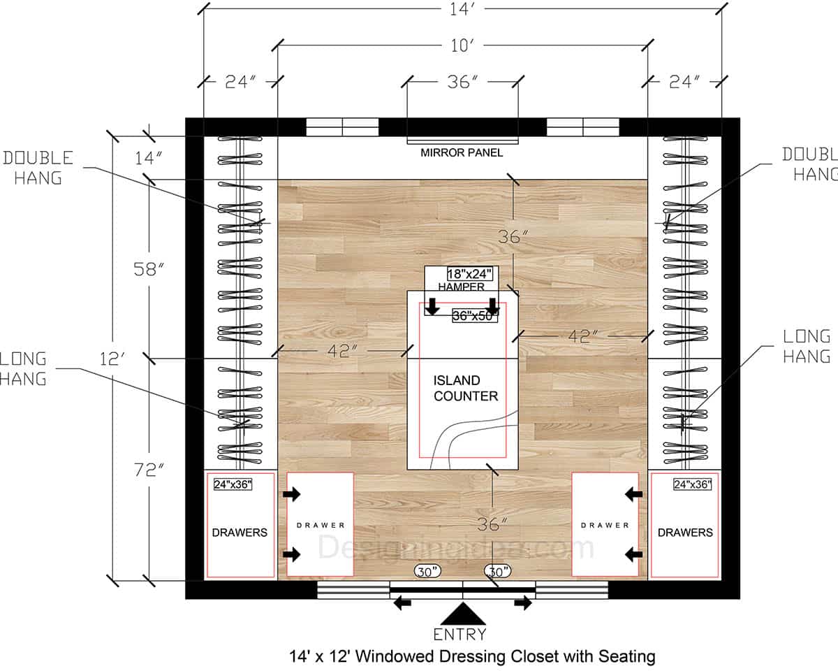 Layout Details: This walk-in closet goes for a gallery-style by using clothing racks ending in shelving along the two top and bottom 14-ft walls with a slim island for staging in the middle and a vanity against the far left. You enter from the right with double-hang runs lining both sides, the 30″ x 72″ island anchors the space and allows one to position an elegant chandelier overhead to give the space a luxe feel. The dedicated vanity niche sits on the left, is perfect for doing your hair, makeup, or storing accessories. You’ll also find pull-out drawer stacks near the entry for quick grab-and-go storage on the run. The design has balanced aisles measuring 33″ on each side of the island that give enough space for two people to use at once without bumping into each other.